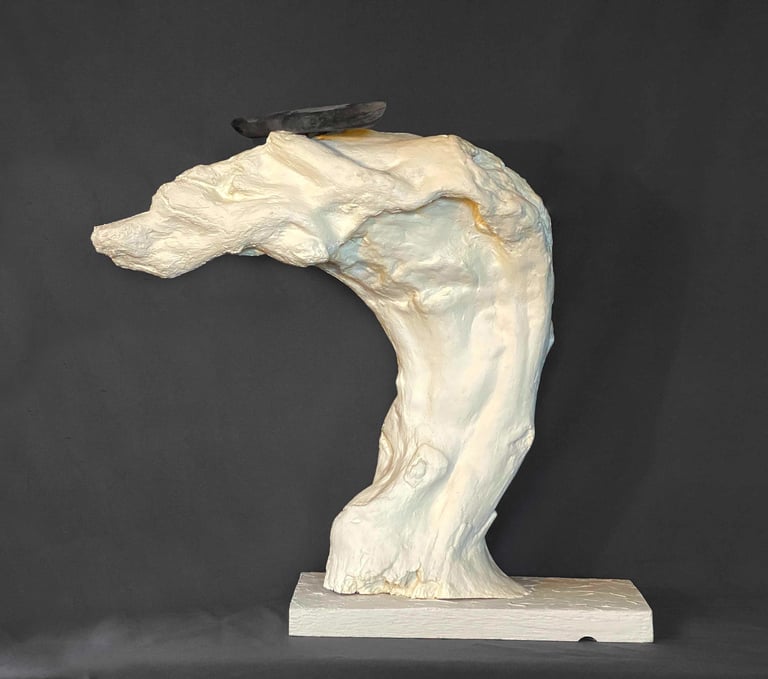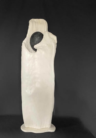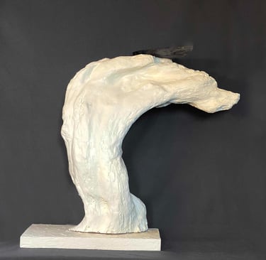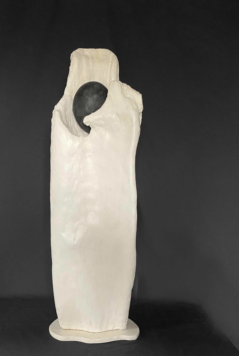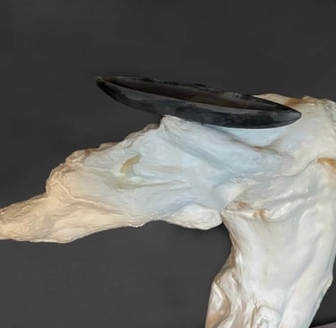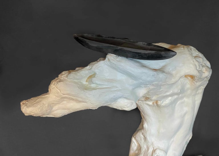 Nagomi 1. wood, stone, plaster. 25 inches in length. cream white and black