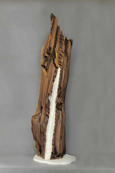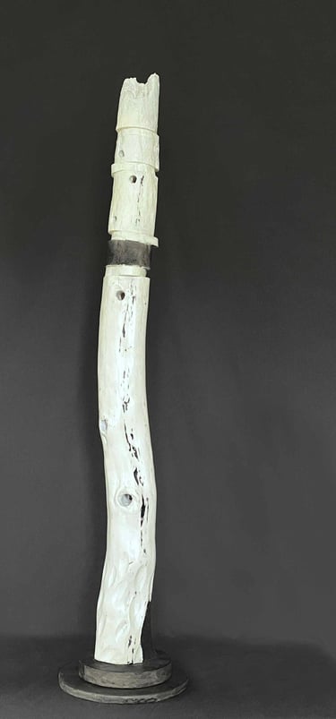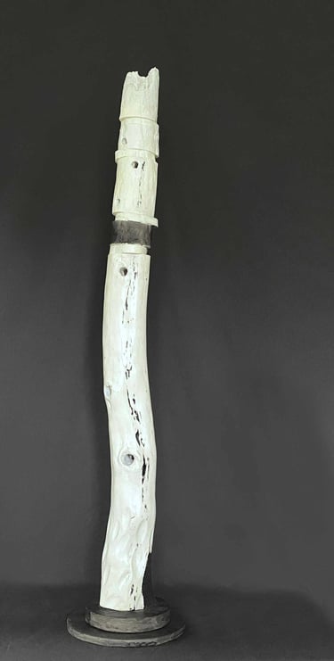 These sculptures are created from cedar driftwood encountered on the shores of Vancouver Island, Japanese Washi paper, glass, paint, ink and occasionally stone. Most of them are approximately 25 inches in height. All Moonrise and Sandolar sculptures are $800.00 ca