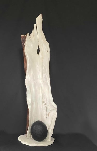 Yamasora 2: The Awakening. cedar, Japanese Washi paper, glass sphere, charcoal, paint. 33 inches.