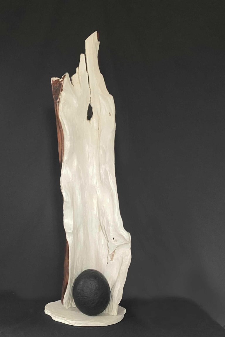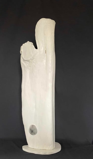 Nagomi 2. wood, stone, sand dollar, plaster. 32 inches. cream white and dark grey,