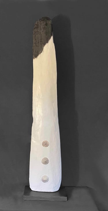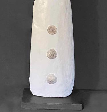 Nagomi 2. wood, stone, sand dollar, plaster. 32 inches. cream white and dark grey,